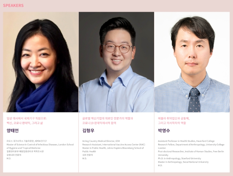행사는 강연과 패널토크 및 Q&A로 구성되었으며, 강연 파트에서는 '글로벌 보건의 넓고 다양한 현장 속의 의료전문가’를 주제로, 국제기구, 해외 학계, 다국적 기업에서 활동 중인 의료 전문가들이 강연합니다. 특히 양태언 세계보건기구 라오스 국가사무소 기술자문관, 김형우 GSK Acting Country Medical Director, 박영수 Haverford College 보건학 조교수가 참여하여 다양한 주제를 다룹니다.